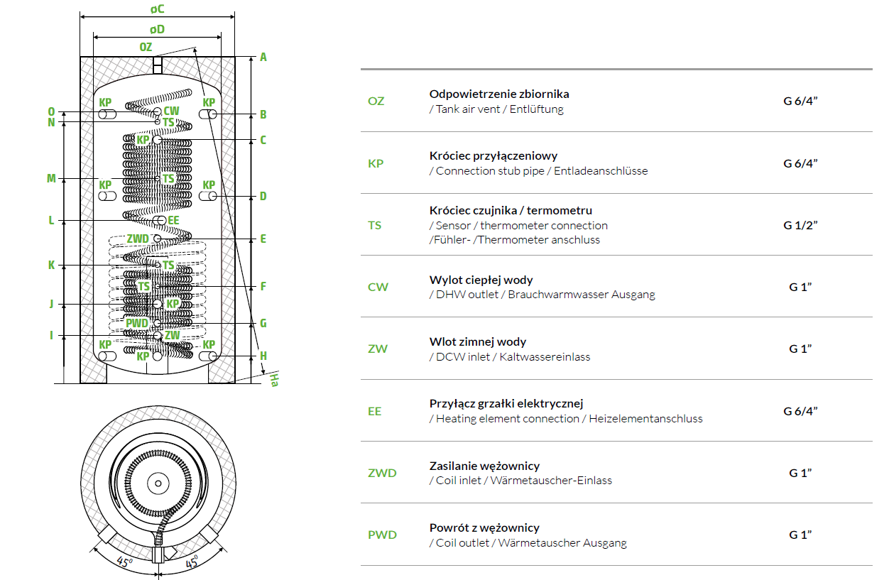 ✅Średnica przyłącza wężownicy CWU: 5/4”