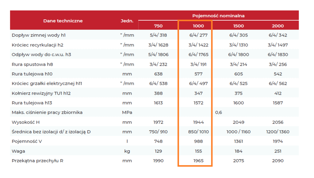 Średnice przyłączy CWU: 6/4”