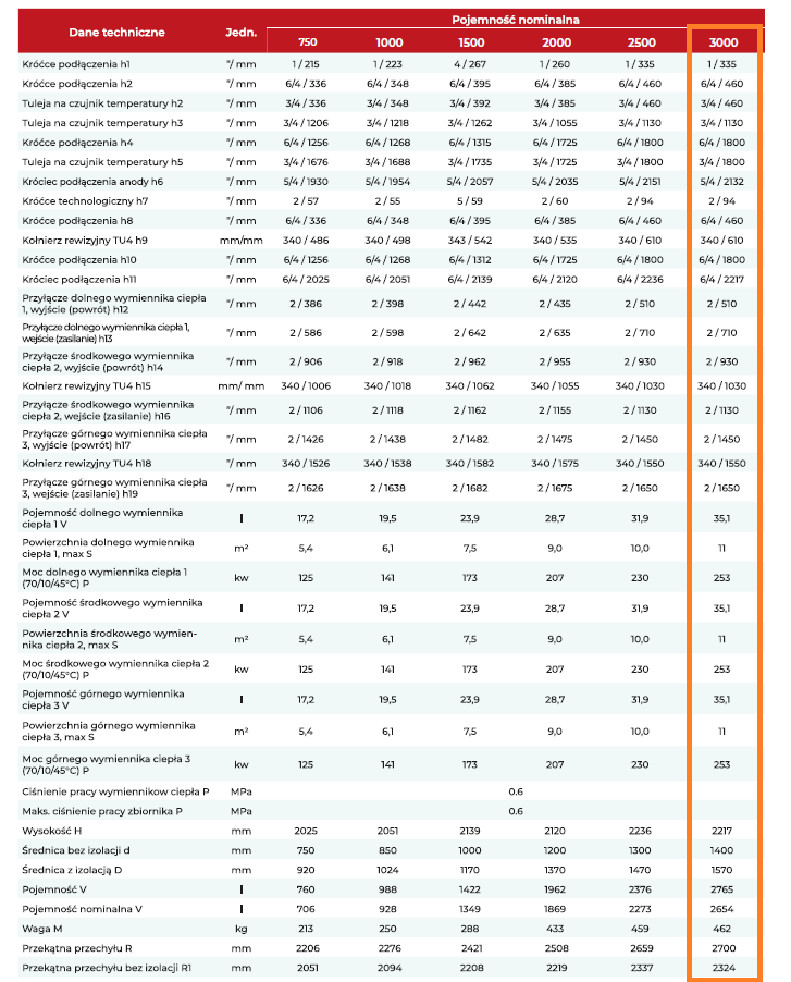 Model BBT-444-3000 to przemysłowy zasobnik ciepłej wody użytkowej o pojemności 3000 litrów, wyposażony w trzy niezależne wężownice spiralne, każda o imponującej powierzchni 11 m². Łączna powierzchnia wymiany 33 m² pozwala na błyskawiczne przekazywanie ciepła z kotłów o mocy nawet 60 kW – przy takich parametrach cały zbiornik nagrzewa się od 40°C do 60°C w zaledwie 38 minut. To sprzęt zaprojektowany do ciągłej pracy w systemach o bardzo dużym i nieregularnym zużyciu CWU – np. w dużych hotelach, halach sportowych, szpitalach, zakładach przetwórczych, myjniach, kuchniach przemysłowych i instalacjach hybrydowych z wieloma źródłami ciepła.